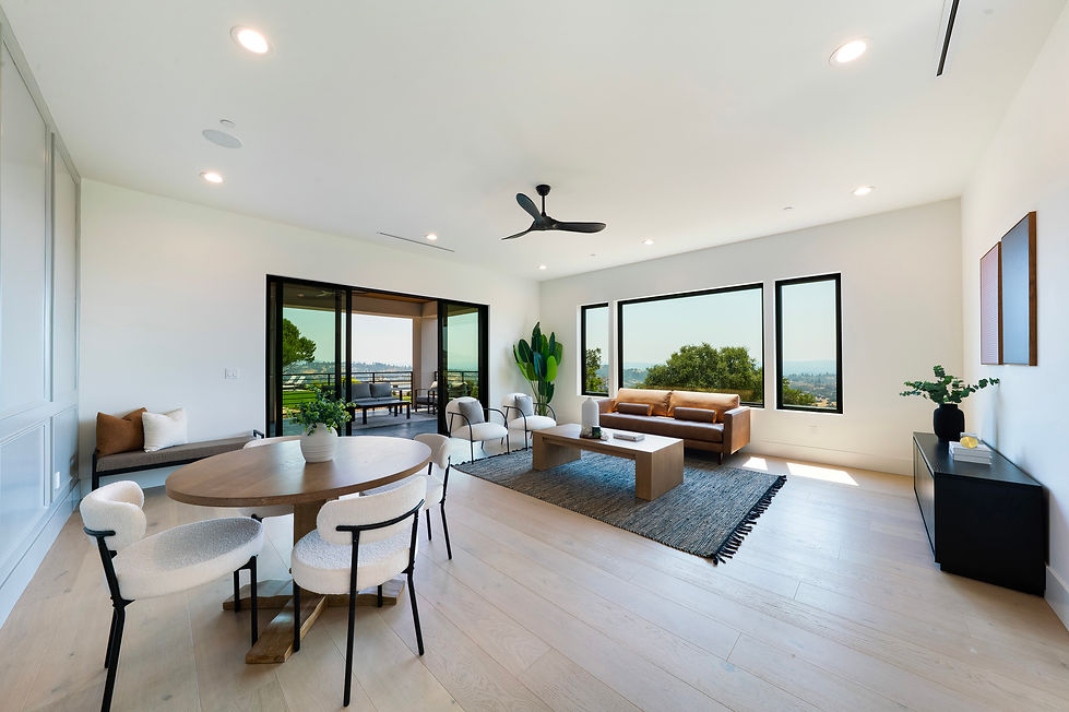 Elevated above the valley on 3.67 acres, this architecturally refined Wine Country retreat offers uninterrupted panoramic views and a lifestyle defined by seamless indoor-outdoor living. Expansive terraces, an outdoor kitchen, and a resort-style pool with custom fountain and pool house invite effortless entertaining and everyday enjoyment. 10-foot glass entry doors usher in natural light and frame captivating vistas from the moment you arrive. The great room flows into a chef's kitchen with alder cabinetry, quartz countertops, a dual-fuel range with grill and griddle and a light-filled butler's pantry with wine storage. The main level also features an office, guest suite, a richly paneled powder room, and a serene primary suite with a generous walk-in closet and a spa-like bath featuring a soaking tub, marble floors, and a floor-to-ceiling tiled shower. Downstairs, a spacious family/game room opens to a second view deck, accompanied by two additional bedrooms and a designer full bath with dual sinks. Above the home, a mature olive grove perfect for an outdoor dining experience under the twinkling lights, while the acreage offers versatility for future vision whether garden, hobby vineyard, shop, or barn.